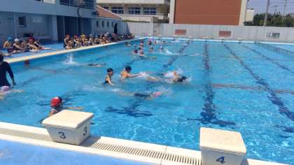 3年生から大プールなのですが、みんな楽しそうに入水していました。少し怖がってる人もいましたが、先生につかまりながら次第に水に慣れ笑顔になりました。