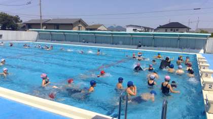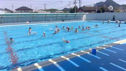宝探しをしたり、全員が同じ方向に円を描くように泳ぎ流れを作る人間洗濯機をしたり、1年ぶりの水泳を楽しみました。最後は2分間だけ自由泳ぎ!「やったー!!」の歓声と、水しぶきが飛び交っていました。