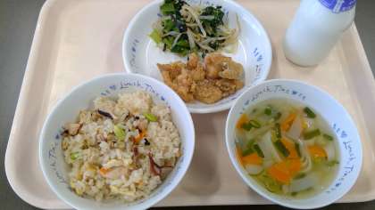 ○ たこめし 牛乳 鶏肉の唐揚げ 磯香和え ふしめん汁