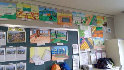 図工の授業では、絵の具を使って「わたしのお気に入りの場所」を描きました。なぜその場所を選んだのかを色やぬり方、構図で表現することができました。自分が楽しかったこと、頑張ったことなどを思い出しながら一生懸命制作する姿が印象的でした。