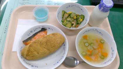 贅沢な話です。私は「両方出して!」とお願いしましたが、「無理です!」と即答されました。4時間目の後半、ランチルームに授業を見に行くと、まだ、調理場でパンを揚げている様子を見ることができました。調理員さんは、揚げたてのパンを子どもたちに食べてもらいたいと、ぎりぎりまでパンを揚げていたのです。この姿を見て、「両方!」と言った自分が恥ずかしくなりました。(真鍋)