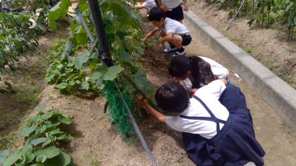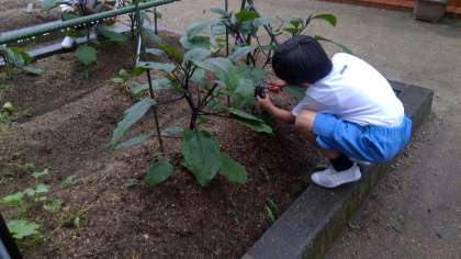 2年生が畑で育てている野菜が大きくなり、毎日交代で収穫して持ち帰っています。水をやりながら、野菜とにらめっこ。持ち帰れる大きさになるのを楽しみに世話をしています。少しずつなのでお料理するのも大変かもしれませんが、ご家庭でおいしく味わっていただければと思います。