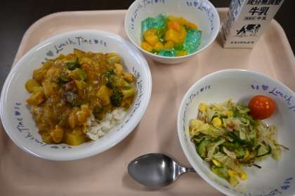 今日のメニューは、「カレーライス」に「元気サラダ」に「クラッシュゼリー」。きっと、子どもたちも大喜びですね。