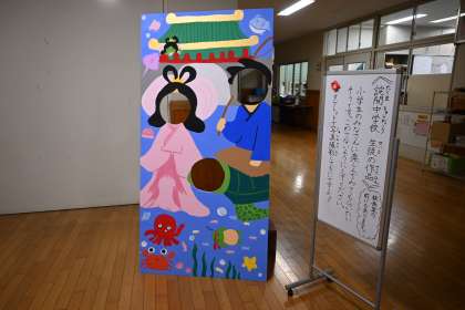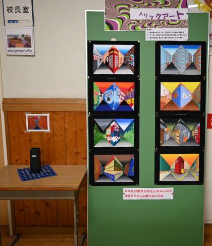 詫間中学校の生徒が制作した作品を、校長室前と横の2か所に展示しています。少し離れて体を左右に移動すると動いて見える不思議な絵に驚いたり、丸い穴から顔を出してタブレットで記念撮影をしたりする子どもたち。詫間中学校の生徒の皆さん、ありがとうございます。この作品は来週の金曜日(2/14)まで展示しています。