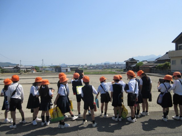 田井集会場からぐるっと回りバス停の方向から戻ってきました。土地の高低差を体感し、高い所から見る詫間小学校の美しさに歓声が上がりました。これまでのコースとは通る車が違うことに気付き、驚く子どもたちもいました。トラックやバスではなく、トラクターなどの農作業用の車を何台も見付け、土地の使われ方と関連付けて学ぶことができました。