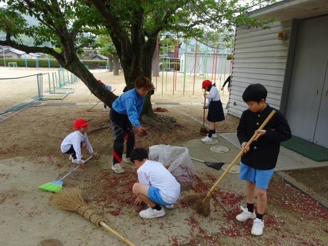 美しく咲いていた桜が今では緑の葉でいっぱいになっています。花びらやがくの部分がたくさん落ち、外そうじ担当の子どもたちは毎日のように「うわー今日もいっぱいや!!」と言いながらも黙々と掃除をしてくれていました。6年生が1年生7人のお世話をしながら一緒に頑張ってくれたおかげです。運動場には草も生えてきました。次はみんなで草抜きも頑張ります。