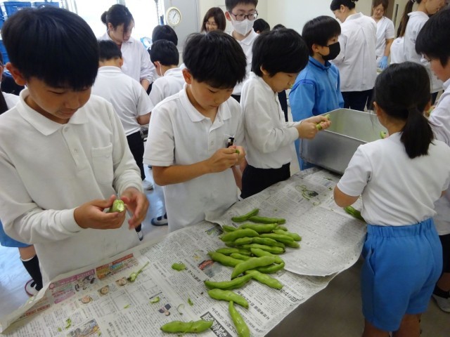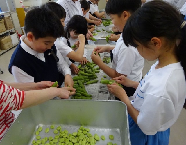 今日は、給食の時間に「そら豆のさや取りをお手伝いしてくれる子は昼休みにお願いします」という放送がありました。栄養教諭からの話をしっかり聞き、爪は短く手をきれいに洗っている、そして、仲よく活動できる子がたくさん集まりました。調理員の皆さんも一緒にしてくださり、「ふわふわで気持ちいいよ!中に3個入っているね」「あっ小さくてかわいいのもあるよ」と楽しく会話しながらお手伝いができました。取ったそら豆は明日の給食に登場します。食べるのも楽しみです。