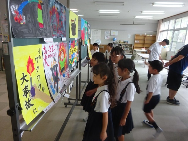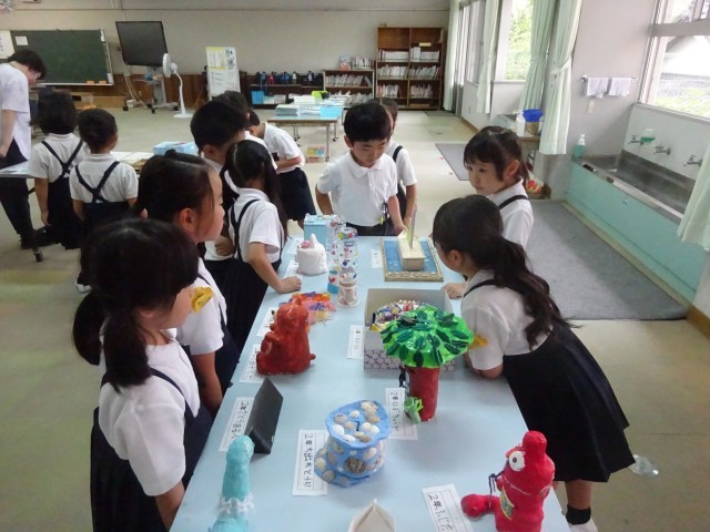 本日の、朝の活動の時間は「校内作品展」でした。夏休みに作成した作品を展示し、お互いに見て回りました。豊かな発想の自由研究やユニークなアイデアの工作、丁寧に色を塗ったポスターや絵など、力作がたくさんありました。高学年では、家庭科の作品も展示していました。他の学年の人の作品を見る時間は、とても楽しい時間になったようです。