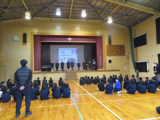 5年生は、総合的な学習の時間に取り組んだ「詫間町のみりょく」についての探求活動をプレゼンにまとめ、全校生に発表しました。調べたことを要点を絞って分かりやすくまとめていたので、低学年の子にもよく伝わりました。この学習を通して5年生は詫間町の素晴らしさに気付き、ふるさとを大事にする心も同時に芽生えたのではないかと感じました。