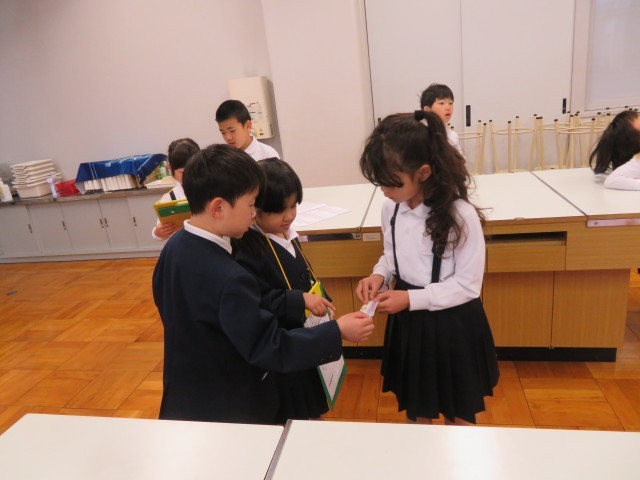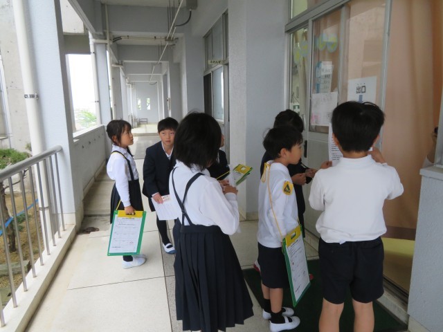 今日の1、2時間目に、1、2年生で学校探検をしました。学校探検では、2年生が1年生に、いろいろな教室の案内をしてくれました。案内する予定の教室や体育館には、2年生が書いた教室の名前を書いた用紙を貼って分かりやすくしてくれていました。上手に説明をしている2年生を頼もしく感じました。