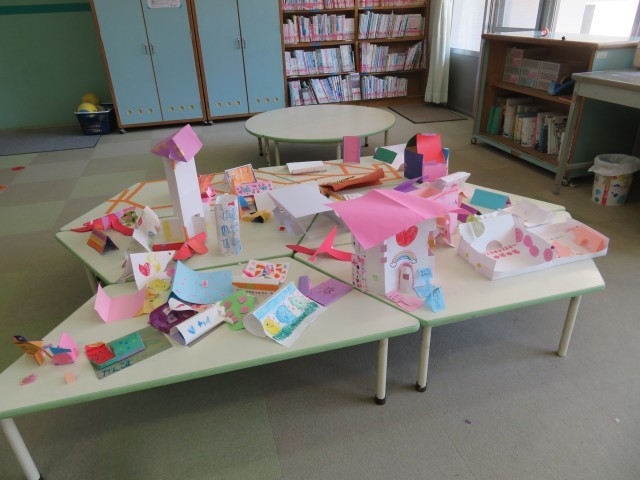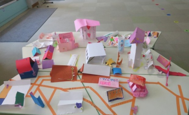 1年生みんなで、松崎小学校を中心にした自分たちの町をつくりました。紙をいろいろな折り方で折って、立たせて、自分たちの町にあったらいいなと思うものをつくるという学習をしました。駅や線路、ゾウの家などがある楽しい町ができました。みんなで、一つの大きな作品をつくるという協働的な学びの場となりました。