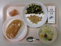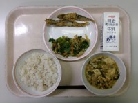 11月5日(水)麦ご飯牛乳納豆みそししゃもの磯辺揚げ野菜のぽん酢醬油あえ厚揚げと...