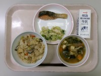 12月1日(月)こぎつねご飯牛乳鮭の塩焼きちしゃもみかぼちゃのみそ汁(食文化) ...
