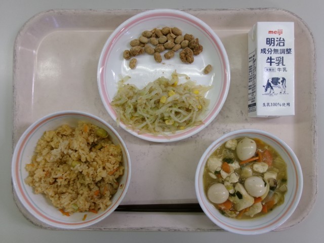 成長期のみなさんは、じょうぶなほねをつくるためにバランスのとれた食事や運動をすることが大切です。特に骨をつくるもとになるのは、カルシウムという栄養素ですが、今の日本人はカルシムが足りていないといわれています。今日の給食で、カルシウムを多く含む食品は、牛乳・大豆・豆腐・きな粉・緑黄色野菜の葉ねぎ・にんじんなどがあります。