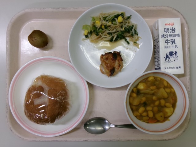 今日のデザートには、キウイフルーツがでていますね。これは、日本の温暖な地域に自生する、暑さや風に強いシマサルナシと、食味のよいキウイフルーツを交配して育成した一口サイズのキウイフルーツです。香川県と香川大学が、病気に強く、食味のよい品種を開発し、平成26年に「キウイっこ」として品種登録されました。