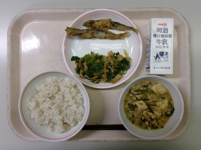 私たちの体は、毎日、毎食の食べた物からできています。そのため、成長期を迎え、大人になるための体を作る準備をしっかりしておかなければならない皆さんには特に食事の内容が大切です。色々な栄養素が必要ですが、現代の日本人が不足しがちだと言われているのが「鉄」です。鉄には肉や魚などの動物性食品に多く含まれる「ヘム鉄」と、野菜や豆類などの植物性 食品に含まれている「非ヘム鉄」があります。「ヘム鉄」は体内に入ると吸 収しやすく、「非ヘム鉄」は体内の酵素の助けを借りて体内に吸 収されます。今日の給食では、「ヘム鉄」を含む豚肉・かつお節や「非ヘム鉄」を含む大豆・チンゲン菜・食べて菜を使っています。しっかりかんで、胃酸を分泌させることで鉄分の体内への吸収をより良くする助けになります。しっかりかんで食べましょう。