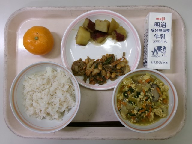 今日のメニューも2年4組の生徒が考えたメニューになります。特徴としては、みかんやさつまいも、ごぼうなど季節の食材をたくさん取り入れました。さつまいもの収穫時期は、8~11月頃ですが、食べ頃は10~1月だそうです。収穫後に貯蔵することで余分な水分が抜けて甘みが増すため、おいしく食べられます。また、さつまいもやみかんはビタミンが多く含まれています。ビタミンはウィルスへの抵抗力を高めることができる為、体調を崩しやすいこの時期にぴったりだと思い、取り入れました。