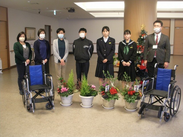 12月24日(水)に環境委員の代表が「ふたな壮」を訪問し、車いすとプランターをお届けしました。