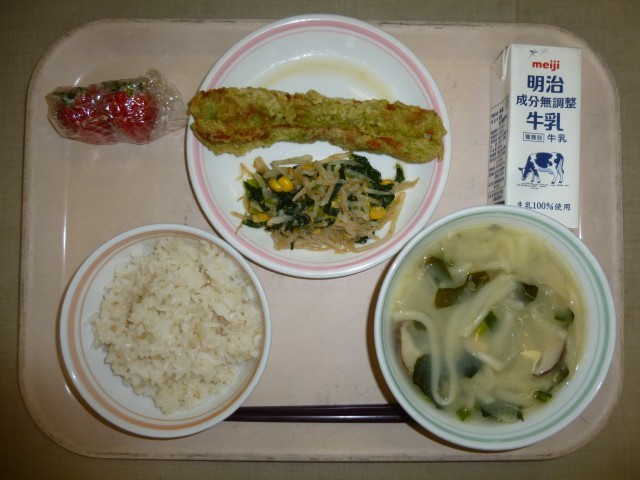 まずは「麦ごはん」です。「麦ごはん」は手前の左側に置かれていますか? 次に「わかめうどん」は右側に置かれていますか? では、その奥に「ちくわの磯辺揚げ」と「もやしのごま酢あえ」が置かれていますか? 和食ですので、皿の上側に「ちくわの磯辺揚げ」、下側に「もやしのごま酢あえ」がくるように置きましょう。和食の時も、洋食の時も、食器の置き方には決まりがあります。