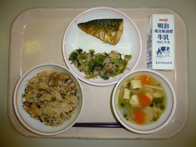 鉄には肉や魚などの動物性 食品に多く含まれる「ヘム鉄」と、野菜や豆類などの植物性 食品に含まれている「非ヘム鉄」があります。「ヘム鉄」は体内に入ると吸収しやすく、「非ヘム鉄」は体内の酵素の助けを借りて体内に吸収されます。今日の給食では、「ヘム鉄」を多く含む鯖や鶏肉、「非ヘム鉄」を多く含む豆腐や油揚げ、ひじきを使った「ひじきごはん」が登場しています。しっかりかんで、胃酸を分泌させることで鉄分の体内への吸収をより良くする助けになります。ぜひ、よくかんで食べましょう。