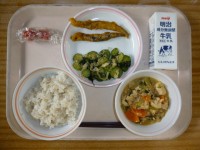 6月12日(木)の給食麦ご飯牛乳ししゃものカレー揚げきゅうりもみ焼き豆腐のみそそ...