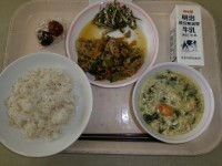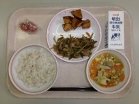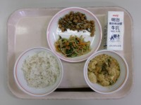 9月8日(月)の給食麦ご飯牛乳大豆とかえりの揚げ煮野菜のナムル三豊なす入り麻婆豆...