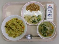 9月17日(水)の給食カレーピラフ牛乳ミモザサラダきなこ豆チンゲン菜とチヌ団子の...