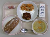 9月19日(金)の給食全粒粉パン牛乳手作り豆腐ハンバーグキャロットサラダ英字マカ...