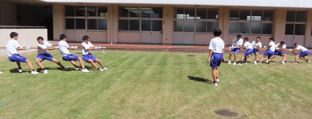 ルールを考えるために各学年の男子が綱引きを行いました。3年生の綱引きは、気合が入っていました。