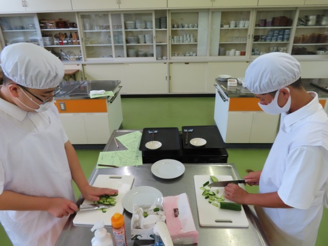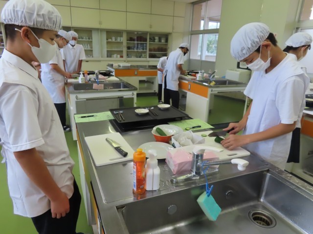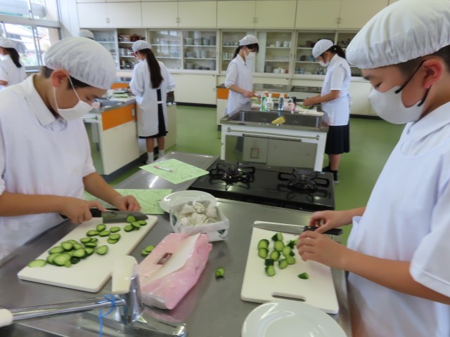 9月4日(木)、1年生は家庭科の時間にキュウリの輪切りに挑戦しました。