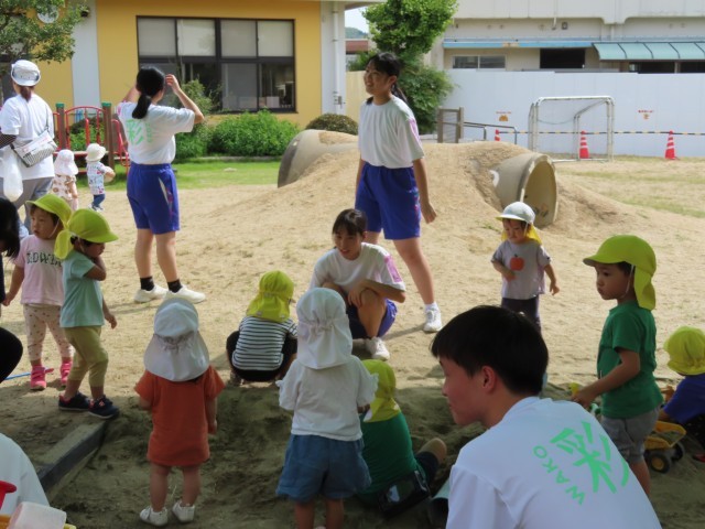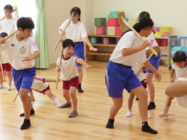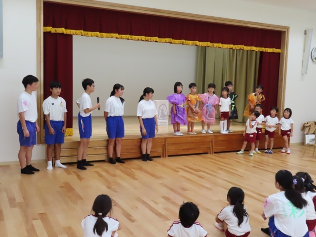 園児と一緒に遊んだり、きりん組さんが披露してくれた「すもうとりぼうず」の劇を見ました。その後、きりん組さん・うさぎ組さんの子ども達と一緒に鍬おどりを踊りました。
