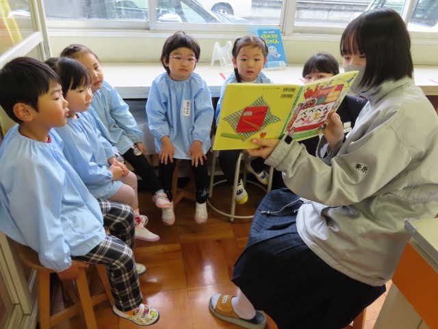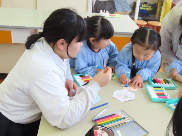 2時間目は2年生が絵本の読み聞かせを行いった後、一緒に絵をかいて交流を深めました。