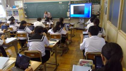 1年生は、タブレットを使って世界の国の様子を調べています。