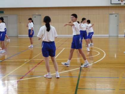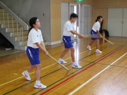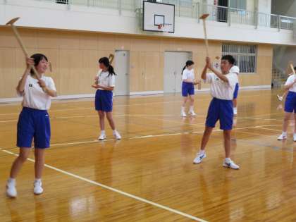 1年生は鍬おどりの練習をしています。互いに教え合いながら、何度も練習に取り組んでいます。