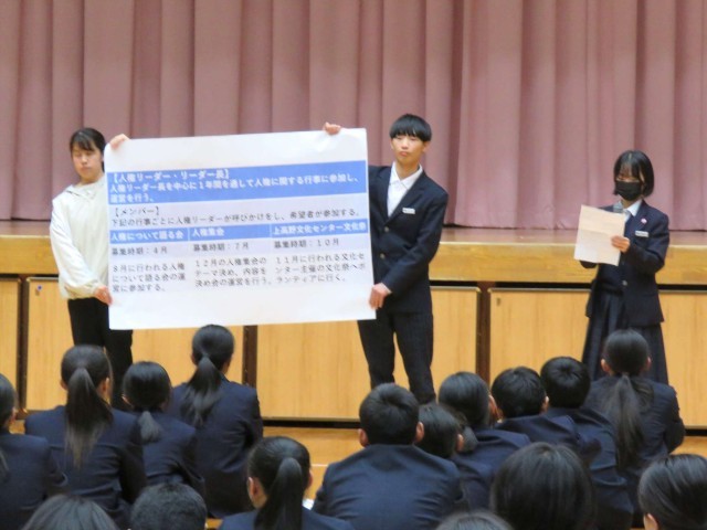 全校集会において『人権プロジェクト~豊中人権守ルンジャー~』のメンバー募集の呼びかけがありました。「人権について語る会」や「人権集会」などの運営スタッフとして積極的に活動してくれる人を求めています。みんなの人権意識を高めて笑顔あふれる豊中中学校をつくっていきましょう!