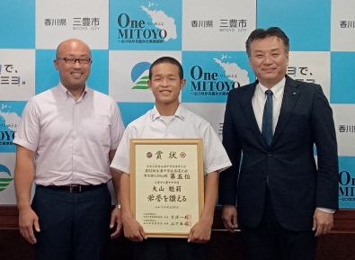 全中柔道大会5位入賞報告 公開日 2021/09/16 更新日 2021/09/16 その他 2021年9月14日(火) 8月25日に行われた全国中学校柔道大会では、3年生の大山魁莉さんが5位入賞という素晴らしい成果を収めました。 三豊市の山下市長を訪問し、入賞を報告しました。