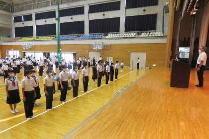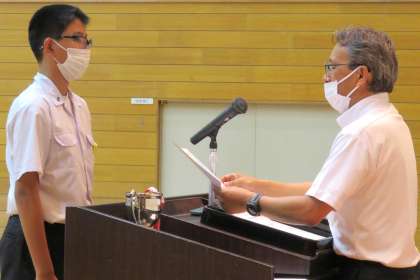 生徒会役員の任命と後期学級委員の任命 公開日 2021/10/14 更新日 2021/10/14 学校全体 2021年10月14日(木) 全校集会で任命式が行われ、先日の生徒会役員選挙で選ばれた7名の生徒が任命書を受け取りました。 続いて各学級で選ばれた後期学級委員及び常任委員が任命されました。 新旧生徒会役員交代式では、旧役員一人ひとりによる離任の挨拶の後、新役員にバッジが引き継がれました。 そして、新生徒会役員から決意の言葉が語られました。 豊中中学校の新たなスタートです。