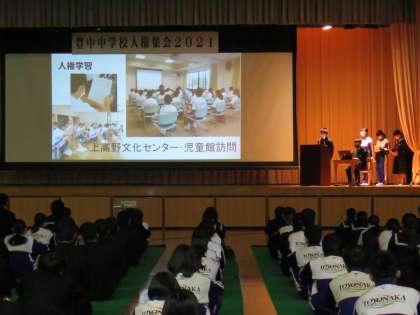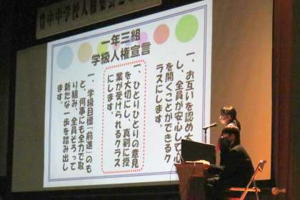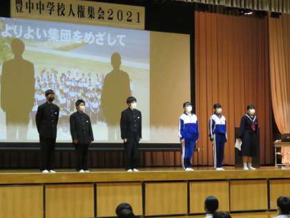 人権集会:1年団の発表 公開日 2021/12/10 更新日 2021/12/10 学校全体 2021年12月9日(木) 人権集会が行われました。 仲間づくりや人権学習の取り組み、学級人権宣言の振り返りについての報告が行われました。 最初は1年団の発表でした。