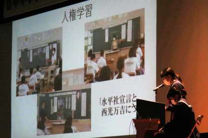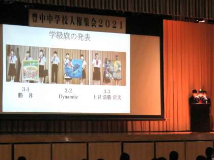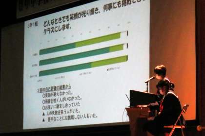 人権集会:3年団の発表 公開日 2021/12/10 更新日 2021/12/10 学校全体 2021年12月9日(木) 人権集会における3年団の発表です。 仲間づくりや人権学習の取り組み、学級人権宣言の振り返りについての報告が行われました。