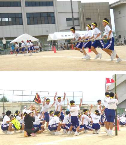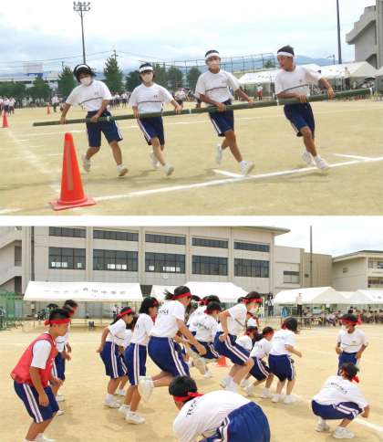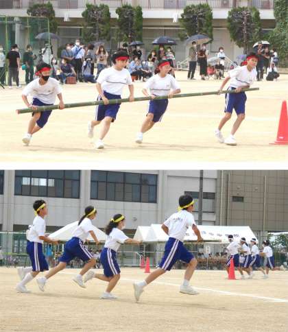 体育祭:1年団種目 青竹グルグル 公開日 2022/09/21 更新日 2022/09/21 学校全体 2022年9月17日(土) 1年生のクラス対抗種目「青竹グルグル」です。 七宝山から切ってきたばかりの新鮮な青竹を持ち、コーンをぐるぐる回ってスピードを競いました。