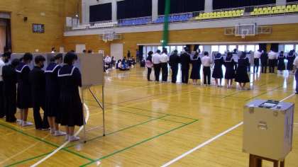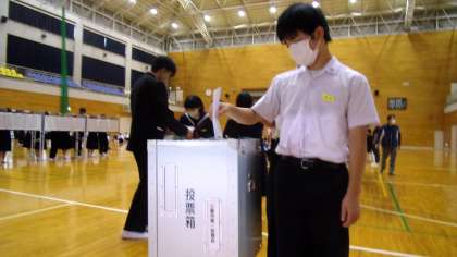 生徒会役員選挙 公開日 2022/10/07 更新日 2022/10/07 学校全体 2022年10月7日(金) 生徒会役員選挙が行われました。 投票に先立って立会演説会が開かれ、立候補者が全校生徒の前でスピーチをしました。 力強い言葉から各立候補者の決意が感じられました。 演説を聞き終えた全校生徒は、記載台で記入した後、投票箱に1票を投じました。 選挙結果の発表は10月11日(火)の朝です。