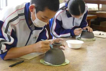 本校では毎年1年生が岡本焼の体験学習を行っています。