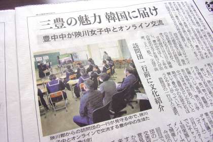陜川女子中とオンライン交流 公開日 2022/12/13 更新日 2022/12/13 その他 2022年12月13日(火) 三豊市は韓国の陜川(ハプチョン)郡と友好都市関係にあり、本校では陜川女子中学校と連携して交流事業を行っています。 11月に実施したオンライン交流会のようすが本日の四国新聞で紹介されましたので、お知らせしておきます。