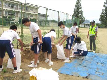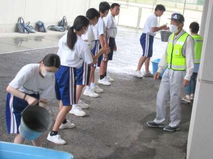 防災委員会 公開日 2023/08/24 更新日 2023/08/24 その他 2023年8月23日(水) 防災委員会が行われ、地域の自主防災組織の方々から様々な防災技術のノウハウを教えていただきました。防災委員のメンバーは、蒸し暑い中で汗だくになりながらも真剣な態度でキビキビ動き、多くの知識や技術を身につけました。 2学期に実施される校内防災訓練では防災委員がリーダーとなって全校生徒に伝えてもらいます。