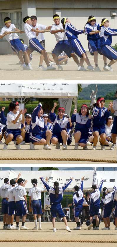 体育祭:3年生の頑張りpart1 公開日 2023/09/19 更新日 2023/09/19 3年生 2023年9月16日(土) 3年団種目の「安心してください。走りますよ」、学級代表による豊中SASUKEリレー、3年全員の青春のクラス対抗綱引きに頑張りました。