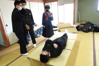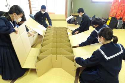 ダンボールベッド 公開日 2021/04/28 更新日 2021/04/28 学校全体 2021年4月27日(火) 放課後、第1回防災委員会の活動が行われました。 この防災委員会は常任委員会とは別に、今年度から新たにスタートした組織です。 防災に役立つ知識と技能を身につけ、2学期の防災訓練の際に他の生徒に伝授するリーダー的役割を担ってもらう予定です。 今回は避難所で用いられるダンボールベッドの組み立てにチャレンジしました。 ※校長通信No.2も参照ください。