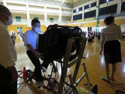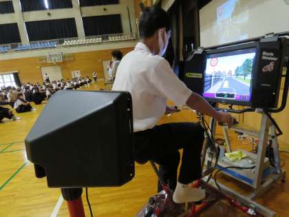 生徒による自転車シミュレーターの実演や、生卵を利用したヘルメットの安全性検証実験など、具体的に学ぶことができました。