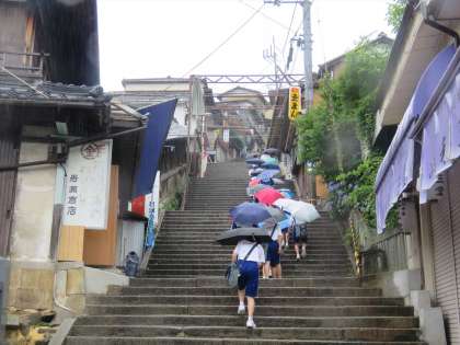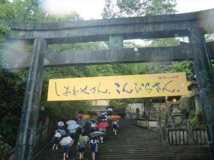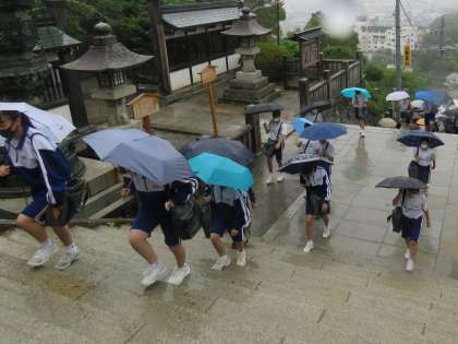 校外学習その1(2年生) 公開日 2021/06/18 更新日 2021/06/18 2年生 2021年6月16日(水) 校外学習に出かけました。 目的地は仲多度郡琴平町の金刀比羅宮です。 この日は梅雨らしい天気となり、傘を差しての活動は大変でしたが、参道口から御本宮までの785段を頑張って歩きました。