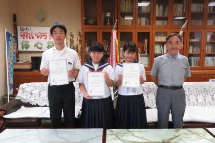 放課後、香川県予防医学協会の森田純二先生(香川タバコの害から健康を守る会の会長)が来校され、校長室で表彰式が行われました。