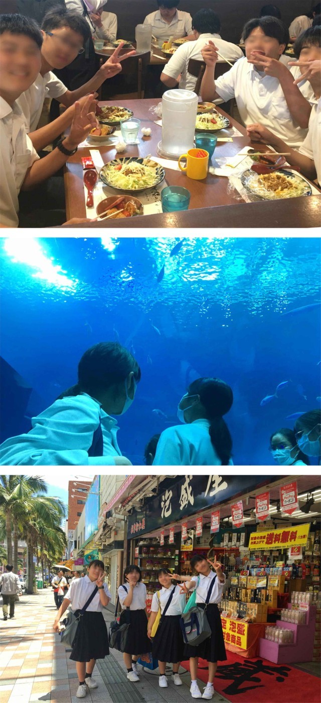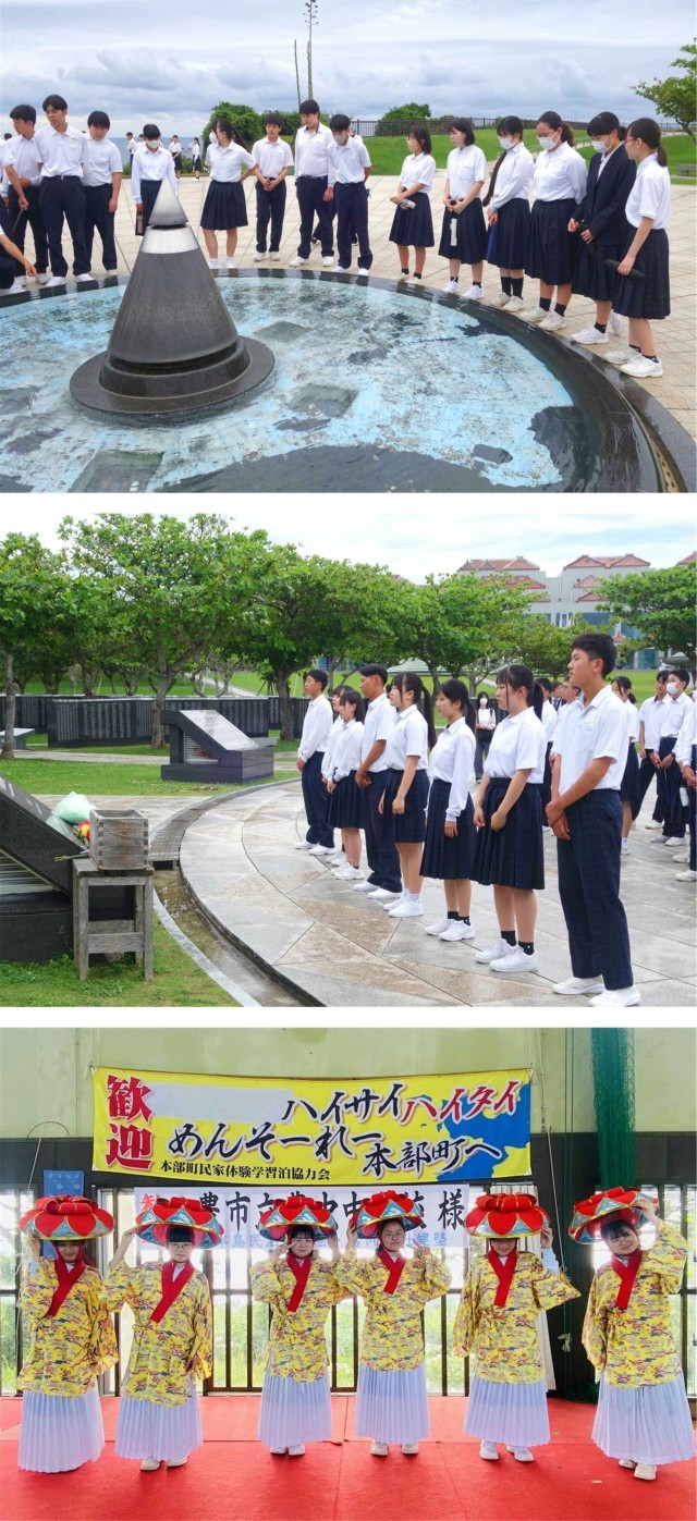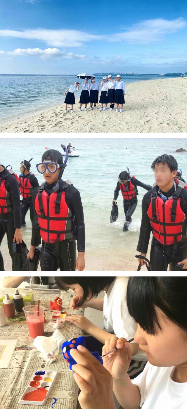 修学旅行 公開日 2025/05/19 更新日 2025/05/19 3年生 2025年5月12日(月)~14日(水) 3年生が沖縄への修学旅行に出かけました。平和祈念公園では沖縄戦で犠牲になった戦没者の冥福を祈るともに、二度と戦争の悲劇を繰り返さないことを誓いました。その後、美しい海でのマリンスポーツ体験や工芸品の制作などを通して沖縄の自然や文化を学びました。民泊先でお世話になった沖縄の住民の方々との交流もかけがえのない思い出となりました。